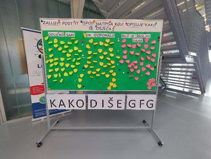 Završnog dana Festivala provedena je aktivnost Kako diše GFG? kojoj je bio cilj „izmjeriti“ emocionalna stanja naših učenika. Učenici su trebali tijekom velikog odmora ispod odgovarajućeg naslova zalijepiti post-it papirić kako bi označili kako se tog dana osjećaju. Mogli su označiti sljedeće: Odlično sam!, Ok, ide pomalo! i Bilo je i boljih dana!. Odaziv učenika bio je velik, a na kraju je ploča bila prekrivena papirićima.